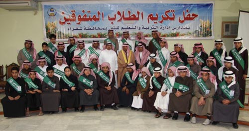 احتفلت إدارة التربية والتعليم بمحافظة شقراء بتكريم 55 طالباً من مختلف الصفوف الدراسية للمرحلتين المتوسطة والثانوية، بحضور مدير التربية والتعليم عبد العزيز المسند ومساعده للشئون التعليمية سعد أبوعباة ومساعده للشئون المدرسية عبد الرحمن المنيع ومديري المدارس وأولياء الأمور والأسرة التعليمية. وقد بدئ الحفل بالتقديم للطالبين معاذ المجيول ومحمد الجبر، ثم تلاوة آيات من القرآن الكريم للطالب مشاري البقمي، ثم كلمة المتفوقين للطالب أحمد الحجي، وقدم الطالب محمد التوم قصيدة، ثم تم تقديم عرض مرئي. وفي الفقرة الخاصة بالتكريم تم تسليم الهدايا والدروع وشهادات التقدير، ثم وجه بعدها مدير التعليم كلمة للحضور شكرهم فيها وأثنى على من تفوقوا، مهيباً بالجميع السعي للحصول على أعلى الدرجات في هذا العام والأعوام القادمة، ثم تناول الجميع طعام العشاء المعد بهذه المناسبة.