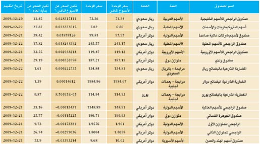 يُذكر أن تسعة صناديق من أصل أربعة عشر صندوقاً لدى الراجحي المالية سجلت ارتفاعاً في قيم وحداتها مقارنة بالأسبوع الماضي، بينما نجدها كلها سجلت ارتفاعاً خلال العام.. وعشرة صناديق من أصل أربعة عشر تجاوزت نسبة الارتفاع فيها الـ10%.