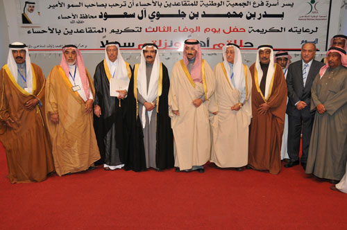 كرَّم صاحب السمو الأمير بدر بن محمد بن جلوي آل سعود محافظ الأحساء أمس 882 متقاعداً من قطاعات مدنية وعسكرية وتعليمية في حفل يوم الوفاء الثالث الموحد، الذي نظمه فرع الجمعية الوطنية للمتقاعدين بالأحساء في قاعة هيئة الري والصرف، بحضور رئيس مجلس إدارة الجمعية الفريق عبدالعزيز هنيدي ووكيل المحافظة خالد البراك ورؤساء الدوائر الحكومية والوجهاء والأعيان ورجال الأعمال. وبيَّن الفريق هنيدي أن عدد فروع الجمعية بلغ 11 فرعاً في مختلف مناطق المملكة، تسعى جميعها لتحقيق ما يتطلع إليه المتقاعد، مستعرضاً الآمال التي تسعى الجمعية لتحقيقها لأعضائها. مشيرا إلى أن عدد أعضاء فرع الجمعية يناهز 2000 عضو، وقد خطا الفرع خطوات مباركة في خدمة المتقاعدين بشتى البرامج والأنشطة والفعاليات، وشكّل لجاناً لتفعيل أهداف الجمعية، ودعا القطاع الخاص إلى الاستفادة من خبرات المتقاعدين والمتقاعدات باعتبارها كنوزاً مغمورة.