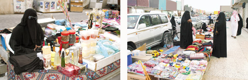 وفي أحد الأسواق التجارية المشهورة بحي السويدي لُوحظ تواجد عدد قليل من البائعات المقيمات بعكس الأسواق الأخرى والغالبية لسعوديات كبيرات في السن اتخذت كل منهن مكانها أمام بسطتها.. وتحدثت في البداية أم محمد (أربعينية) تجلس أمام بسطتها المتعددة الأنواع ويقف إلى جانبها عامل آسيوي تقول إنه يساعدها في حمل أغراضها وتذكر أنها اضطرت للبيع حتى تنفق على أبنائها الأيتام..