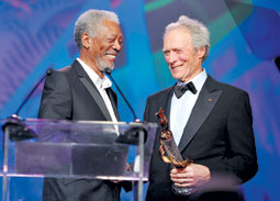 الممثل والمخرج والمنتج السينمائي كلينيت إيستوود وعلى يساره مورغان فريمان خلال حفل مهرجان بريديل السينمائي الدولي وتسليم وود جائزته كمخرج سينمائي