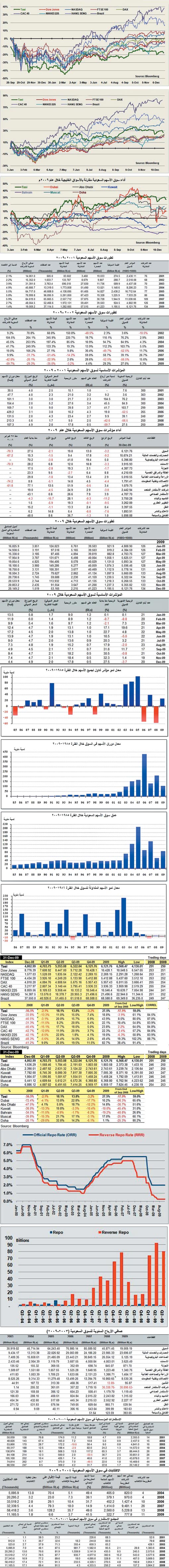 أنهت السوق المالية السعودية أعمالها (250 يوم عمل) خلال عام 2009م على نموٍ صاف بلغ 27.5 في المائة، لتغلق عند مستوى 6.121.76 نقطة، مقارنةً بأعلى خسارة سجلتها في تاريخها الممتد منذ عام 1985م التي وصلت إلى 56.5 في المائة خلال عام 2008م (250 يوم عمل). وارتفعت القيمة السوقية الإجمالية للسوق إلى نحو 1.2 تريليون ريال محققة معدل نمو سنوي بلغ 29.3 في المائة مقارنةً بمستواها الأدنى بنهاية 2008م البالغ 0.925 تريليون ريال. وفي جانب قيمة التداولات خلال العام المنصرم 2009م فقد سجلت انخفاضها للعام الثالث على التوالي بنحو -35 في المائة، لتجتمع عند مستوى 1.28 تريليون ريال مقارنةً بنحو 1.97 تريليون ريال بنهاية العام الماضي. كما تراجعت الكميات المنفذة من الأسهم المتداولة خلال عام 2009م بنحو -3.2 في المائة إلى 57.5 مليار سهم، مقارنةً بنحو 59.4 مليار سهم تمَّ التنفيذ عليها خلال العام الماضي. ولحقت بها أيضاً عدد الصفقات المنفذة خلال العام لتسجل تراجعها للعام الثالث على التوالي بنحو -29.3 في المائة، مجتمعةً عند 37.1 مليون صفقة خلال العام، مقارنةً بنحو 52.5 مليون صفقة خلال عام 2008م.