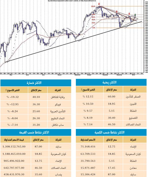 شهد سوق الأسهم السعودية تداولات تفاؤلية إيجابية.. وهو أول أسابيع هذا العام لعل أن هذه الإيجابية تشير إلى تفاؤل المتعاملين بالعام الجديد.. يُضاف إلى هذا ترقب السوق لنتائج أعمال الشركات للربع الرابع وللعام 2009.. كما يشير أيضاً إلى تفاؤل المتعاملين بنتائج أعمال الشركات للربع الأخير.. وأيضاً يضاف إليه الأداء الإيجابي للأسواق العالمية وارتفاع أسعار النفط.. كلها عوامل انعكست على مؤشر سوق الأسهم السعودية الذي تمكن من حصد مكاسب بلغت 2.27%.. وكان هذا الأسبوع إيجابياً بامتياز حيث حقق مكاسب في جلسات تداوله الخمسة.. وكان السوق قد تذبذب خلال الأسبوع في مدى 159 نقطة متذبذباً بين مستوى 6.269 نقطة كأعلى مستوى أسبوعي ومستوى 6.110 نقاط كأدنى مستويات الأسبوع.. أيضاً تمكن السوق من الإغلاق أعلى من مستوى المتوسط المتحرك الموزون 50 يوماً والواقع عند 6.205 نقاط لتضاف إلى النقاط الإيجابية التي حققت.. وأيضاً فقد تجاوز المؤشر مستوى القمة الثلاثية التي كانت تشكل مقاومة لتحركات السوق عند 6.125 نقطة.. وكانت هذه القمة قد تشكَّلت منتصف العام الماضي 2009 قبل أن يتراجع السوق نحو مستويات أدنى من 5.400 نقطة.. واستمرت التحركات الإيجابية حتى جاوز المؤشر مستوى المقاومة عند 6.180 نقطة دافعةً المؤشر نحو تجاوز مستوى المتوسط المتحرك 50 يوماً.. ومستوى المقاومة الثانية الواقعة عند 6.245 نقطة.