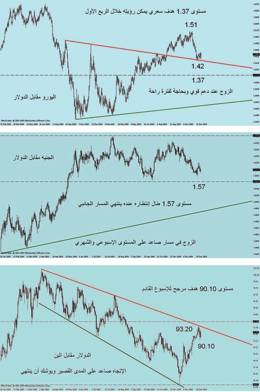 كانت البيانات الاقتصادية قليلة هذا الأسبوع وأهم ما فيها سيظهر بعد كتابة هذا التقرير لكن بالمجمل يمكننا الحديث عن طلبات الإعانة لآخر أسبوع في ديسمبر والتي بلغت 432 ألف طلب مقارنة بالرقم السابق 452 ألف طلب تظهر انخفاض ومؤشر جيد على إمكانية تلمس أرقام متفائلة بشأن معدلات البطالة وهذا الانخفاض كان بفعل القطاع الصناعي القطاع الأهم في أمريكا، أما مستويات الإنفاق على التشييد والبناء في نوفمبر انخفضت 0.6% بعدما كانت مستقرة في القراءة السابقة، ويعزى ذلك إلى تراجع النشاط في سوق المنازل في الفترة الأخيرة، ولدينا هنا مؤشر جديد على تحسن الصناعة الأمريكية ولا سيما أنه جاء قبيل موسم الاستهلاك وهو معدل الطلبات الصناعية حيث أعلن وفقاً لشهر نوفمبر عن نمو 1.1% مقارنة بالارتفاع السابق 0.6% ولابد أن ينعكس على النتائج المالية للموسم الرابع. وتفاعلت أسواق الأسهم هناك خصوصاً (داو جونز) بقمة سعرية جديدة. وفي جانب مشرق من هذا الأسبوع أعلن عن أرقام ADP الذي يقيس التغير في سوق الوظائف بالقطاع الخاص، وفي قراءة شهر ديسمبر تظهر أنه خسر 84 ألف وظيفة مقارنة بخسارة 169 ألف وظيفة للرقم الأخير من هذا التقرير دليل تقليص في حجم التسريح بل هناك نمو في عدد الموظفين الجدد خصوصاً للمتعاقدين على نظام (full-time)، وكما يبدو من الأرقام أنها متوازنة بعض الشيء انعكس ذلك على حركة منطقية في أسواق الأسهم لكن بالنسبة للدولار بعد فرحه بتعثر دبي العالمية واليونان والحذر الشديد من النتائج المالية مع نهاية العام كل هذه العوامل التي يقتات عليها الدولار وجهود ترتيب المتوسطات المتحركة في الحركة الفنية مع كل ذلك جاءت إمدادت النفط لتختنق في عنق زجاجة أبعدت المتحوطين عن العملة الخضراء مما جعلها تصاب بنوبة اكتئاب وتجمد في الحركة أمام سلة عملاته.