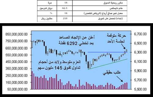 جلسة الأحد لا يرجح أن تكون هادئة بل يمكن أن تنمو أحجام التداول إلى 145 مليون سهم بقيادة أسهم كبيرة في القطاع البتروكيماوي بالإضافة إلى عملية اختبار مشروعة لمستوى 16359 نقطة في قطاع المصارف، وبدمج حركة التداول لآخر 50 جلسة يرجح أن يغلق السوق عند 6.355 نقطة بعد تجربة سريعة لمستوى 6.374 نقطة وأبرز مهام القطاعات تتجه نحو الاتصالات حيث لا بد من التعرف من جديد على منطقة 1.940 نقطة هل ما زالت تحتضن البائعين حتى الآن أم لا؟