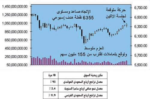 جلسة الاثنين تفتتح فيها أسواق النفط وهي مرشحة للمزيد من الأرقام الخضراء حيث يستهدف خام نايمكس مستوى 84 دولاراً للبرميل وبعد نتيجة سهم السعودي الهولندي المخيبة للآمال وتوازن أداء السعودي الفرنسي وخلوه من المفاجآت ومع الأرقام الإيجابية لمجموعة سامبا، يصبح المؤشر العام مؤهلاً لتوسيع نطاق تذبذبه بحدود 60 نقطة، وبدمج حركة التداول لآخر 51 جلسة يرجح أن يغلق السوق عند 6.355 نقطة بعد تجربة سريعة لمستوى 6.374 نقطة خصوصاً بعد إعلانات المصارف تصبح السيولة أكثر سخونة ويرجح حدوث تعاملات بحوالي 155 مليون سهم.