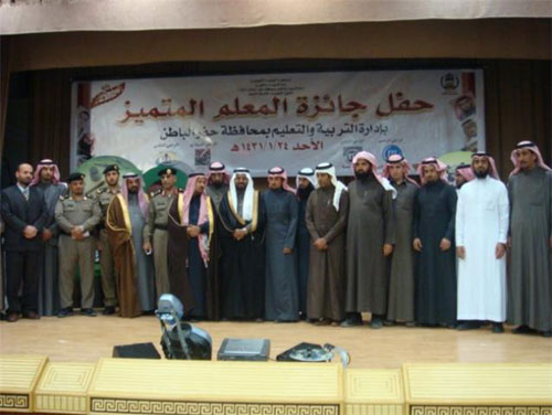 برعاية وكيل محافظة حفر الباطن مسلط بن عبد العزيز الزغيبي وبحضور عدد من مديري الإدارات الحكومية وقادة الميدان التربوي بالمحافظة أقام الإشراف التربوي بالإدارة أمس حفل جائزة المعلم المتميز للعام الدراسي.