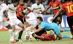 أهدر المنتخب الانغولي فوزا في المتناول على نظيره المالي وسقط في فخ التعادل 4 - 4 في افتتاح النسخة السابعة والعشرين من نهائيات كأس الامم الافريقية لكرة القدم التي تستضيفها انغولا حتى 31 يناير الحالي. وكان المنتخب الانغولي في طريقه الى تحقيق فوز ساحق على مالي عندما تقدم برباعية نظيفة تناوب على تسجيلها فلافيو امادو (36 - 43) وجيلبرتو (68 من ركلة جزاء) ومانوشو (75 من ركلة جزاء) بيد ان لاعبيه تراخوا في الدقائق الاخيرة الى جانب التبديلات التي اجراها مدربهم البرتغالي مانويل جوزيه باخراج فلافيو وجيلبرتو في الدقائق الأخيرة دفعوا ثمنها غاليا واستقبلت شباكهم 4 اهداف في ظرف 15 دقيقة حملت تواقيع سيدو كيتا (80 - 93) و وفريدريك عمر كانوتيه (89) ومصطفى ياتاباريه (95) وفرض لاعب الشباب السعودي فلافيو امادو، ولاعب فريق الاهلي المصري جيلبرتو نفسيهما نجمين في المباراة حيث سجل الاول هدفين وصنع الثالث لجيلبرتو الذي كان وراء الهدف الرابع، لكن صحوة مالي في الدقائق الاخيرة عكرت على الانغوليين الفرحة العارمة التي عمت الجماهير التي اعتقدت ان منتخب بلادها حسم المباراة، وحرمتها من مواصلة الاحتفال الذي بدأته في حفل الافتتاح.