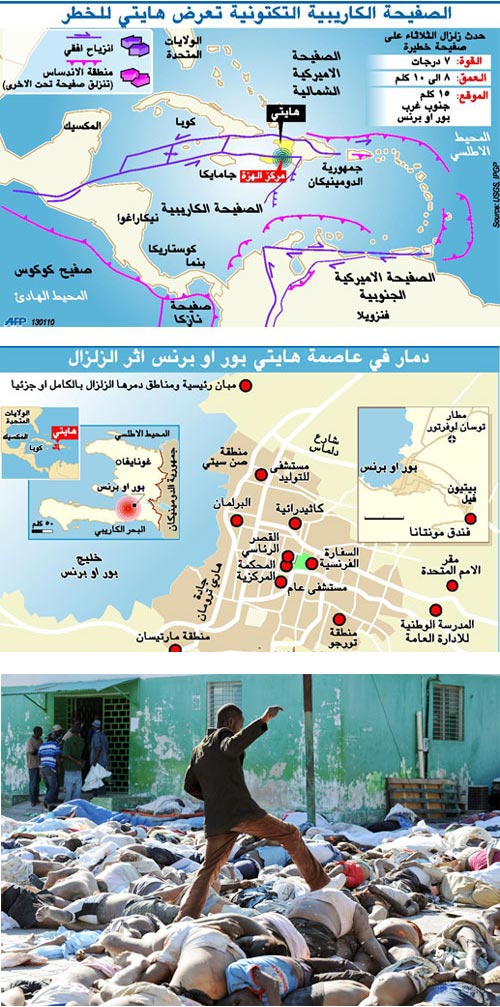 وأعلن جون هولمز مسؤول العمليات الإنسانية في الأمم المتحدة أنه سيوجه أمس نداء لجمع 560 مليون دولار لمساعدة ضحايا الزلزال في هايتي. وقال هولمز: إن الأموال ستستخدم لتوفير الطعام والمواد الطبية والمياه والخيم، ويضاف دمار البنى المحلية ومشكلات النهب إلى العوائق اللوجستية، فبرنامج الأغذية العالمي التابع للأمم المتحدة الذي قرر إرسال مساعدات طارئة لمليوني منكوب، أعلن أمس أن مخازنه في بور أو برانس تعرضت (للنهب). وقالت لوسيل وهي ناجية من الزلزال: (إذا لم تصل المساعدة الدولية فإن الوضع سيتدهور سريعا، نحن بحاجة للماء والمواد الغذائية سريعا). وسمعت عيارات نارية متفرقة فيما قال شهود: إن المدينة شهدت أعمال نهب. كما أعلنت واشنطن أن السلطات الكوبية سمحت لها باستخدام مجالها الجوي بغية إقامة جسر جوي بين الولايات المتحدة وهايتي لتسريع وصول المساعدات. وأعلن رئيس هايتي السابق جان برتران اريستيد المقيم في المنفى في جنوب أفريقيا منذ الإطاحة به عام 2004 استعداده للعودة إلى البلاد للمساهمة في إعادة الإعمار.من جهته، أعلن وزير الخارجية الفرنسي برنار كوشنير أن المؤتمر الدولي لإعادة إعمار وتنمية هايتي الذي تحضر له بشكل خاص الولايات المتحدة وفرنسيا سيعقد في آذار - مارس على الأرجج بدون تحديد مكان انعقاده.