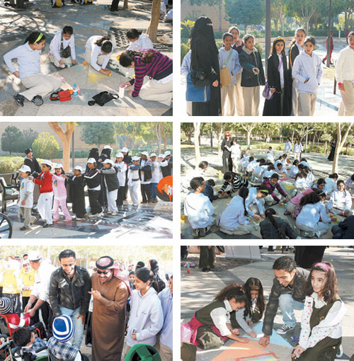 انطلق أمس الأربعاء ولأول مرة في الرياض عند التاسعة صباحاً على رصيف مركز الملك عبدالعزيز التاريخي مشروع: «لوّن رصيفك» تحت إشراف منظمة الفنون الخاصة العالمية، وتحت مظلة مركز العون لذوي الاحتياجات الخاصة، تزامناً مع الاحتفال باليوم العالمي لذوي الاحتياجات الخاصة، وبتزامن هذا المشروع مع 66 دولة في العالم، حيث تم دمج أطفال من ذوي الاحتياجات الخاصة من 6 جمعيات (أكاديمية التربية الخاصة، مركز الأوائل للتأهيل، مركز تدريب الفئات الخاصة (الرعاية النهارية)، جمعية المعاقين في الرياض، الجمعية الخيرية لمتلازمة (داون)، ومركز العباقرة لذوي الاحتياجات الخاصة) مع طلاب وطالبات من مدارس المملكة، ومدارس التعليم المتطور الذين قاموا بأنفسهم بصناعة الطباشير لأشقائهم ذوي الاحتياجات الخاصة في جو رائع من الألفة والانسجام فيما بينهم.
