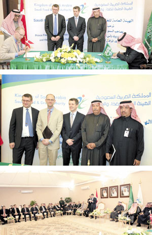 بعدها وقع نائب رئيس الهيئة لشؤون الغذاء الدكتور إبراهيم سعد المهيزع وثيقة مع المدير التنفيذي للإدارة البيطرية والغذائية الدنماركية إسبين إجد راسموسين.