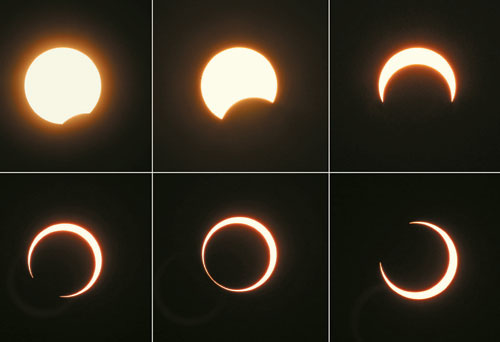 صورة تظهر سلسلة من لقطات كسوف الشمس الحلقي الحاصل يوم الجمعة، فيما أوضح العلماء أن هذه الظاهرة لن تتكرر إلا كل 1000 سنة