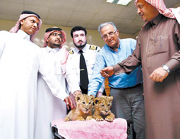 مسؤولون سعوديون برفقة شبلي أسد لحظة إعادتهما لحديقة الحيوان بالرياض بعد العثور عليهما في صندوق خشبي بغية تهريبهما لخارج البلاد والاتجار بهما بطريقة غير مشروعة في منفذ الحديثة شمال المملكة. |