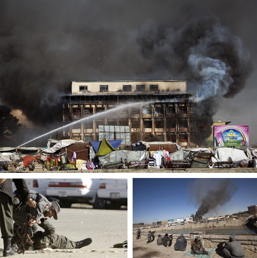 حولت حركة طالبان وسط العاصمة الأفغانية كابول إلى ميدان معركة على مدى حوالي أربع ساعات أمس الاثنين, وذلك من خلال هجمات مسلحة وانتحارية منسقة شنها 20 عنصرا من مقاتليها, مما أدى إلى مقتل 12 شخصاً بينهم 7 مسلحين وإصابة 71 شخصا بجروح. وهاجم مسلحو طالبان والانتحاريين عدة مواقع في