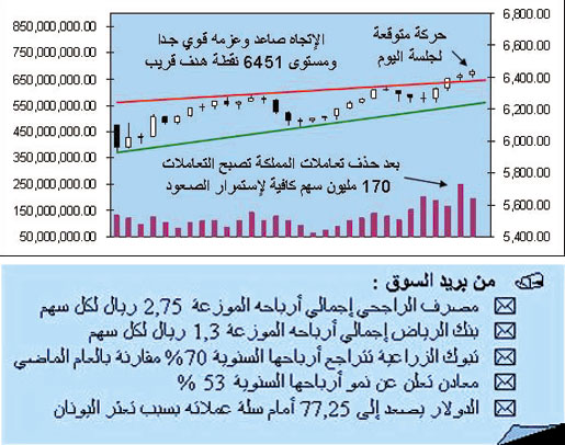 جلسة الثلاثاء لا يوجد فيها ما يؤرق المستثمرين سوى أسواق النفط وهي في عطلة الآن خصوصا في أمريكا، والأمر الآخر هو أرقام سابك المالية ومن وجهة نظر خاصة يبدو أن الشركة لديها مفاجأة في تجميل أرقام الشهرة لديها والوقت مناسب الآن، حيث معظم الشركات شطبت خسائرها ولم يتبق سوى قائدها (سابك)، وستكون الحركة الفنية هي من يقود السوق على الأرجح حيث لا يزال يتحرك في الاتجاه الصاعد ويظهر شجاعة في اختبار مقاوماته في حاجز 6400 نقطة، وبعد دمج حركة التداول لآخر 29 جلسة يتوقع أن يغلق السوق عند 6.441 نقطة أو على الأقل زيارتها.