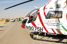 وقالت هيئة الهلال الأحمر في بيان لها أمس: ان أول حالة تم إسعافها عبر «مشروع الإسعاف الطائر» الذي دخل أول أيام خدمته أمس فعلياً كانت لشاب سعودي لحالة حرجة بعد إصابته في حادث مروري في منطقة الثمامة وتم إسعافه عبر الإسعاف الجوية ومباشرة حالته وتقديم الإسعافات الأولية له بعد وصول الفرقة الطبية في زمن لم يتجاوز 25 دقيقة.