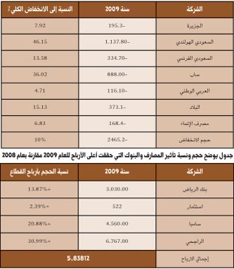 ساهم البنك السعودي الهولندي بنسبة 46% من حجم الأرباح المتراجعة للقطاع ككل حيث سجل أرباحا بلغت 85 مليون ريال بنسبة انخفاض 95% من 1.220مليون ريال فيما احتل بنك ساب المرتبة الثانية من نسبة التأثير التي وصلت إلى 36% محققا 2.03مليار ريال بانخفاض 30% عن العام 2008 الذي وصلت أرباحه فيه إلى 2.9مليار ريال فيما انفرد بنك البلاد بالمركز الثالث وكذلك بتسجيله الخسارة الوحيدة بين جميع المصارف والبنوك حيث حقق خسارة 248 مليون ريال بعد أن كان قد سجل 125مليون ريال ربحاً للعام 2008.