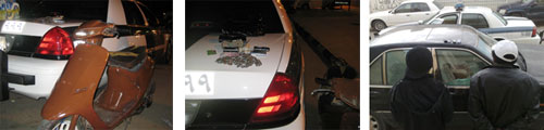 كما ضبطت فرق دوريات الأمن بوسط الرياض شخصاً يحمل شاكوشاً يستخدمه في تكسير زجاج السيارات لغرض سرقة المسجلات والمحتويات حيث وجد عند سيارتين كرسيدا وألتيما قام بتكسير زجاجها بواسطة شاكوش حيث ضبط مع الشخص مشغل دي في دي تابع للسيارة الالتميا وجوال نوكيا ومبلغ من المال وساعة يد كما ضبط مع الشخص مفك وبواجي تستخدم لسرقة السيارات. تم التحفظ على الشخص والمضبوطات وسلم لمركز شرطة البطحاء.