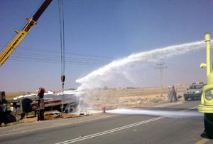 انقلبت ناقلة محملة بالبنزين على طريق خف ساجر عند الساعة الحادية عشرة مساء أول أمس. وقد باشر الدفاع المدني بساجر الموقع بعد ورود بلاغ لغرفة العمليات بقيادة مدير الدفاع المدني بساجر النقيب غازي منصور الغازي ومشاركة فرقة من إدارة الدفاع المدني بالدوادمي. وقد تمت السيطرة على الحريق.
