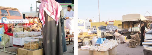 (الجزيرة) قامت بجولة رصدت من خلالها هذا السوق المتجول والمتنوع بشتى أنواع المستلزمات حيث تجد كل ما تريده من مأكل ومشرب إضافة إلى الفواكه والذرة المشوية وبيع الحطمب مع برودة الأجواء في الشتاء، حتى الملابس الشتوية الخفيفة تباع هناك، فهو سوق متجول ومتكامل وإن أردت «الفرو» لتضعه في النار حتى يصبح جاهزاً للأكل لن تجد صعوبة في العثور عليه في هذا السوق، و»البقل» الذي يؤكل مع الشاي ستجده حاضراً أمامك دون العناء والبحث عنه في أماكن البادية حيث تعتبر الأكلة الشهيرة لدى البادية والتي تحضر من حليب الماعز إضافة إلى العبري والمكسرات وغيرها من الأكلات والمشروبات المطلوب خلال الخروج للتنزه.