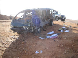 وقع صباح أمس حادث تصادم شنيع وجهاً لوجه بين باص يقل أربع عشرة طالبة وسيارة مرسيدس صغيرة يستقلها شاب وشقيقته، وذلك بين محطة الكهرباء وتقاطع غطي، وأسفر الحادث عن وفاة سائق المرسيدس وشقيقته وثلاث طالبات من الباص المتجه إلى مقر كلية البنات بالقريات.
