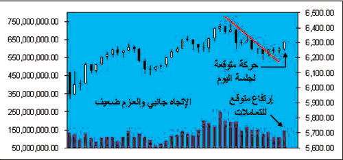 نذكر أن الحركة الفنية لا تزال أبرز المحركات الداخلية للسوق، وبنظرة على متوسط أحجام التداول منذ تسجيل قاع مارس الماضي نجده انخفض إلى مستوى 210 ملايين سهم دليل أن عمليات خفض التكاليف مع تثبيت حاجز 6000 نقطة لا تزال مستمرة، وما يحتاج إليه السوق لتخطي مستوى 6.578 نقطة هو أحجام تداول تتخطى 151 مليون سهم، لكن يتوقع أن نشهد في هذه الجلسة نمو أحجام التداول إلى 130 مليون سهم بدعم من قطاع المصارف الذي يحاول بجد تخطي مقاومة 16.355 نقطة، وبعد دمج حركة التداول لآخر 40 جلسة يتوقع أن يغلق السوق نهاية الجلسة عند 6.305 نقطة مدعومة بسهم سابك نهاية الأسبوع.