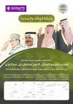 وجه صاحب السمو الملكي الأمير سلطان بن عبد العزيز ولي العهد نائب رئيس مجلس الوزراء ووزير الدفاع والطيران والمفتش العام شكره وتقديره لجمعية الكشافة العربية السعودية وكافة منسوبيها على مشاعرهم الطيبة من خلال وثيقة الوفاء والمحبة التي وقع عليها 115000 كشاف بمختلف مراحلهم الكشفية.