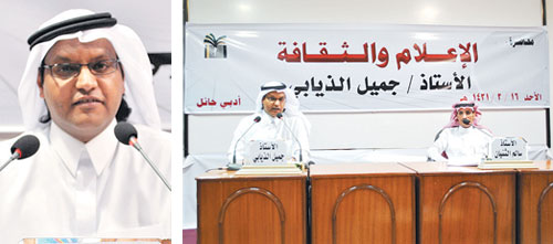 أقام النادي الأدبي بحائل محاضرة «الإعلام والثقافة» للمدير العام والمسؤول عن تحرير صحيفة الحياة في السعودية والخليج العربي جميل الذيابي تحدث خلالها عن الصحافة والثقافة باعتبارهما وسيلة لإنتاج الوعي وصناعة الأفكار وقد بدأت المحاضرة بمقدمة لعضو مجلس إدارة نادي حائل