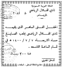 تفاعل الهلالي الأستاذ منصور الصالح مع الزاوية الجديدة في الجزيرة (صدى الماضي) والتي نشرت الجمعة الماضية وكانت الحلقة الأولى عن احتفال الهلال الكبير عام 1397هـ بإقامة حفل فني شارك فيه فنانون من المملكة والخليج فبعث تذكرة لدخول الحفل الفني الساهر الذي أقامه الهلال في ملعب الصائغ قبل نحو أكثر من (30) عاماً بمناسبة فوز الهلال بكأس الملك وشارك فيه فنانون من العراق والكويت واليمن والسعودية والبحرين..