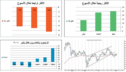 اختتم السوق السعودي»تداول» أسبوعه الماضي عند مستوى 6.281 نقطة ليكون بهذا الإغلاق قد تمكن المؤشر من تحقيق مكاسب ب29 نقطة تقريبا أو ما يمثل 0.46% بلغت القيمة المتداولة 12.9 مليار ريال، وبلغ حجم الأسهم المتداولة 576.9 مليون سهم. نفذت هذه التداولات من خلال 441.7 ألف صفقة. جاء سهم سايكو للتأمين على رأس قائمة الأسهم الرابحة بعد إغلاقه عند مستوى 71.5 ريال مرتفعا بنسبة 24.89% تلاه سهم المتحدة للتأمين الذي ارتفع بنسبة 23.4% وصولا إلى مستوى 38.5 ريال. وكان ثالث الرابحين أول ضيوف العام الجديد 2010 سهم هرفي المدرج حديثا إلى السوق حيث ارتفع السهم بنسبة 13.73% مقارنة بسعر الاكتتاب إلى مستوى 58 ريال. وفي قائمة الأسهم المتراجعة سهم الباحة الذي انخفض إلى مستوى 17.95 ريال متراجعا بنسبة 5.28%، يليه مستوى أنعام القابضة الذي تراجع إلى مستوى 63.5 ريال متراجعا بنسبة 4.51% ، وثالث المتراجعين سهم نادك الذي وصل إلى مستوى 30.1 منخفضا بنسبة 4.14%. في قائمة الأسهم النشطة كان سهم الإنماء على رأس هذه القائمة بتداول 126.1 مليون سهم بعد أن أغلق عند مستوى 12.8 ريال، وأيضا فقد كان سهم الإنماء الأنشط من حيث القيمة بعد أن تداول 1.6 مليار ريال، وجاء سهم المملكة ثاني أسهم النشطة بتداوله 91.7 مليون سهم تلاهما سهم كيان السعودية الذي وصل إلى مستوى 18.2 ريال وبتداول بلغ 25.9 مليون سهم. وبالانتقال إلى قائمة الأسهم النشطة بالقيمة فقد جاء سهم هرفي ثانيا بعد تداوله 917.5 مليون ريال يليه سهم سابك الذي تداول ما قيمته 792 مليون ريال بعد أن أغلق السهم عند مستوى 87.5 ريال.