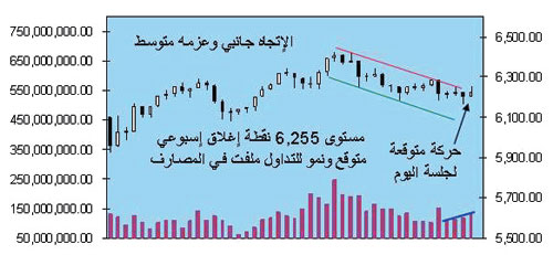 الأربعاء فيه يغلق السوق.. وتحدث عمليات التجميل للحركة الفنية.. حيث يرجح أن يكون هناك تقليص لخسائر الأسبوع.. لكن يصعب حقيقة أن يقوم المؤشر العام بإقفال تعاملاته عند 6.281 نقطة، وهي المنطقة التي افتتح السوق عندها بداية الأسبوع الحالي.. لكن مع عودة النشاط للنفط، وبدء تعويض الخسائر فيه، وبناء على الرسم البياني أعلاه يمكن أن نشهد تواجداً قوياً للمشترين في الجلسة خصوصاً من قطاع المصارف الذي يتوقع أن يغلق عند 16.355 نقطة، وبعد دمج حركة التداول لآخر 73 جلسة نرجح أن يغلق السوق بالقرب من 6.222 نقطة.. وبأحجام تداول تبلغ 131 مليون سهم ضمن المسار الجانبي الحالي.