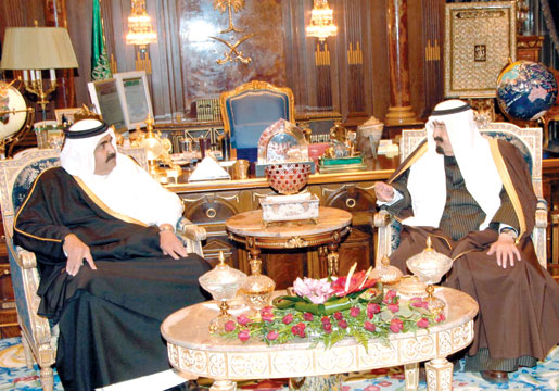 بحث خادم الحرمين الشريفين الملك عبدالله بن عبدالعزيز آل سعود وأخوه صاحب السمو الشيخ حمد بن خليفة آل ثاني أمير دولة قطر الشقيقة مجمل المستجدات على الساحات الخليجية والعربية والإسلامية والدولية وموقف البلدين الشقيقين منها.