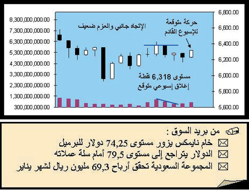 أهم ما يمكن متابعته هو أسواق النفط الأسبوع القادم حيث يتوقع صدور قرارات مشجعة لإنقاذ منطقة اليورو من المتعثرين حيث الآن يعقدون اجتماعا هاما للأسبوع القادم وقد يؤثر بشكل إيجابي على الأسواق خلال إجازة السوق السعودي، أما الحركة الفنية يتوقع أن لا تبتعد كثيرا عن سلوك الأسابيع الماضية القريبة، وبعد دمج حركة التداول لآخر 15 أسبوعا نرجح أن يغلق السوق بالقرب من 6.318 نقطة وبأحجام تداول تبلغ 718 مليون سهم وهي إجمالي الكميات المرصودة للأسبوع المقبل.