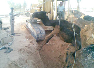 أبلغ مالك جمال مركز علميات الدفاع المدني في القويعية أن أحد جماله سقط في بيارة للصرف الصحي في مزرعة للدواجن بمركز تبراك التابع لمحافظة القويعية، مشيراً إلى أن الجمل أمضى أكثر من يوم داخلها، وعلى الفور تحركت فرق الإنقاذ للموقع حيث البيارة التي يبلغ طولها 20 متر × 6 متر وبعمق 3 متر مغمورة بالمياه، وقد سقط الجمل في الزاوية الجنوبية من خلال فتحة مساحتها 2 × 1 متر. وباشر الدفاع المدني عمله بشفط المياه من داخل البيارة بأربع تريلات -وايتات-، ثم أزيل سقف البيارة، إلا أنه لم يتم العثور عليه في زاوية سقوطه، مما حدا بالدفاع المدني إلى كسر سقف البيارة وإزالته من الجهة الشمالية، ليفاجأ المنقذون بالجمل على قيد الحياة وواقفاً على قدميه، ولم يتعرض لأي إصابات أو اختناق، وتم ربطة وإخراجه (ببكلين) الدفاع وسلم لصاحبه الذي تفاجأ بجمله على قيد الحياة. الجدير بالذكر أن مدير الدفاع المدني بمنطقة الرياض اللواء عابد الصخيري قد أولى الحادث كامل المتابعة والاهتمام حيث أرسل فرقة التدخل في المياه الملوثة وبكلين وشيول لمساندة فرقة مدني القويعية.