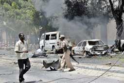 قتل مدنيان على الأقل صباح أمس الاثنين في انفجار سيارة مفخخة استهدفت وزير الدفاع الصومالي يوسف محمد سياد، بحسب ما أفادت مصادر متطابقة. وقال شهود عيان: إن سيارة مفخخة كانت متوقفة قرب فندق أمباسادور في العاصمة الصومالية انفجرت فيما كان وزير الدفاع يشارك في اجتماع. وأعلن الضابط