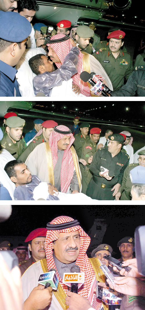 وأكد سموه حرص خادم الحرمين الشريفين على استتباب الأمن والأمان في كل الجوانب، واهتمامه - أيده الله - وسمو ولي عهد الأمين بالقوات المسلحة ومنسوبيها. وأشاد سموه ببسالة منسوبي القوات المسلحة الذين أدوا الأمانة التي أوكلت لهم وحافظوا على حدود بلادهم من كل متسلل وعدو، وأضاف: « هذا ليس بمستغرب على أبناء بلاد الحرمين البررة». وبشأن الألغام التي زرعها المتسللون، قال سموه: « نحن في تنسيق مع الجانب اليمني ليتم تحديدها ونزعها - بمشيئة الله - ونحن بدأنا فعلا بنزعها ونحن حريصون على الحفاظ على الأرواح». وعن وجود وسيط آخر غير الحكومة اليمنية، قال سموه: « لا وسيط غير الحكومة اليمنية، ونحن في تنسيق مستمر مع الإخوة في اليمن وكما قال خادم الحرمين الشريفين «إننا بوجه واحد ونتعامل مع الحكومة اليمنية فقط» مشيرا سموه إلى أن التعاون مستمر على جميع الأصعدة مع الأشقاء في اليمن.