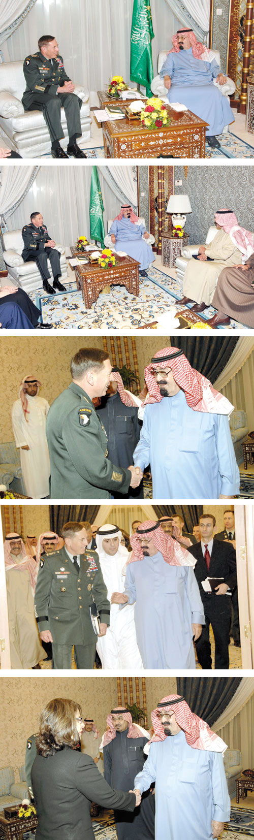 عقد خادم الحرمين الشريفين الملك عبدالله بن عبدالعزيز آل سعود - حفظه الله - وقائد القوات المركزية الأمريكية الفريق أول ديفيد بتريوس اجتماعاً في روضة خريم أمس.