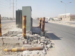 ويظهر من الصورة مدى الخطورة، التي يشكلها المحولان، حيث تتعدد حوادث ارتطام السيارات بهما، ومع ذلك فهما لم يسقطا بسبب الحواجز الحديدية والخرسانية المقامة حولهما.