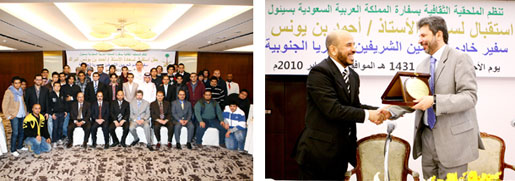 نظمت الملحقية الثقافية بسفارة المملكة العربية السعودية بسيئول يوم الأحد الماضي في فندق لوتيه، حفل استقبال للأستاذ أحمد بن يونس البراك سفير خادم الحرمين الشريفين بجمهورية كوريا الجنوبية، وحضر الحفل موظفو الملحقية والسفارة والطلاب المبتعثون في كوريا.