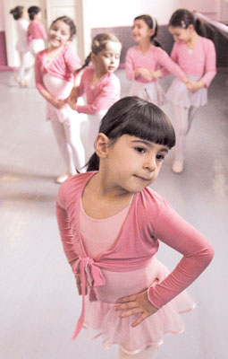 طفلة لم يتجاوز عمرها الرابعة تقوم بتمارين للباليه في مدرسة لهذه الرياضة في منطقة تبليسي بجورجيا وتضم المدرسة أكثر من مائة طفلة تراوحت أعمارهن بين أربعة وثلاثة عشر عاماً |