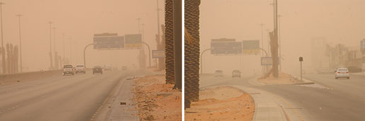 اجتاح الغبار الشديد سماء الرياض يوم أمس الجمعة وحد من مدى الرؤية الأفقية وكأنه يأذن بتغير مناخي ودخول فصل جديد. وتوقعت الرئاسة العامة للأرصاد وحماية البيئة نشاط الرياح السطحية على مناطق شمال المملكة ووسطها وغربها مثيرة للأتربة والغبار، وقد تستمر العواصف الترابية خصوصاً على المناطق الواقعة بين (حائل، القصيم، الرياض، رفحا، حفر الباطن). ومن جانبه أكد مدير مستشفى الملك سعود للأمراض الصدرية الدكتور أسعد مصطفى دمياطي لـ(الجزيرة) أن الإسعاف والطوارئ في المستشفى قد استقبل عصر أمس أكثر من 50 حالة ربو بسبب الغبار خلال نصف الساعة الأولى من اجتياحه، ونصح دمياطي جميع مرضى الربو بملازمتهم منازلهم والابتعاد عن مثل هذه الأجواء في أماكن لا يصلها الغبار أو الأتربة.