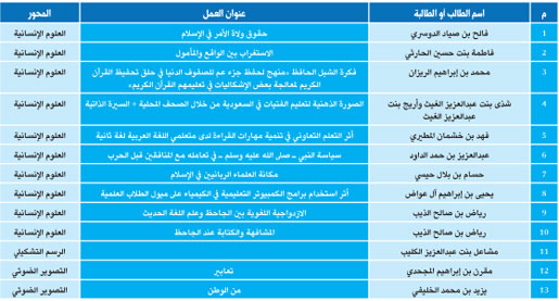 شارك طلاب وطالبات الجامعة بأكثر من 130 عملاً شملت جميع محاور المؤتمر، وترشح منها الأعمال الآتية: