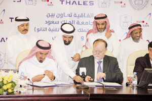 وقعت جامعة الملك سعود ممثلة في معهد الملك عبدالله لتقنية النانو وشركة ثالس الفرنسية العالمية صباح الأحد اتفاقية تعاون بحثي مشترك ووقع عن الجامعة مدير جامعة الملك سعود الأستاذ الدكتور عبدالله بن عبدالرحمن العثمان وعن الشركة الفرنسية نائب رئيس الشركة التنفيذي ماركو ارمان وبحضور السيد بيرتراند بيسانسينو سفير فرنسا بالمملكة.