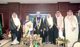 منحت جامعة الملك سعود دولة رئيس وزراء جمهورية الهند الدكتور مانموهان سنغ شهادة الدكتوراه الفخرية. جاء ذلك خلال الحفل الذي أقامته الجامعة بمناسبة زيارة دولة رئيس وزراء جمهورية الهند والوفد المرافق له أمس للجامعة، حيث كان في استقباله معالي وزير التعليم العالي الدكتور خالد بن محمد العنقري ومعالي مدير الجامعة الدكتور عبدالله بن عبدالرحمن العثمان ووكلاء الجامعة وأعضاء هيئة التدريس بالجامعة وعدد من الطلاب.