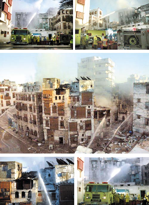 أخمدت 10 فرق إطفاء للدفاع المدني بجدة حريقا هائلا شب عصر أمس في 7 عمائر سكنية في المنطقة التاريخية بالبلد بجدة فيما انهارت إحدى العمائر إضافة إلى جزء آخر من عمارة أخرى.