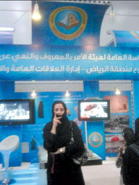 امرأة تلتقط صورة تذكارية أمام جناح هيئة الأمر بالمعروف والنهي عن المنكر بمعرض الرياض الدولي للكتاب. |