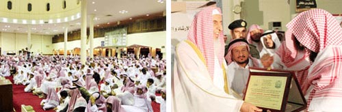 شهد سماحة الشيخ عبدالعزيز بن عبدالله آل الشيخ المفتي العام للمملكة رئيس هيئة كبار العلماء الحفل الختامي لتكريم حفظة القرآن الكريم في حلقات رياض القرآن بجامع عبدالله بن عمر بمدينة الملك سعود السكنية بديراب.