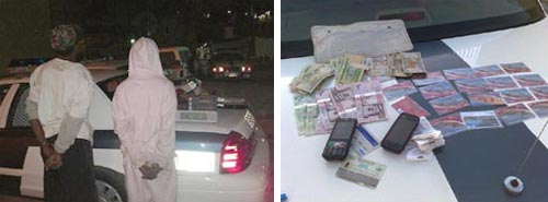 وجاء ذلك عندما تمكَّنت فرق دوريات الأمن من القبض على سيارة من نوع جمس صالون خضراء اللون، قام راكبوها بتكسير تموينات وسرقتها، من خلال كسر الزجاج الخارجي، ثم نزل أحد الأشخاص من السيارة الجمس وركب مع صاحب سيارة أخرى نوع هوندا أكورد وفرَّا. وبمسح الحي من قبل فرق الدوريات تم بفضل الله ضبط السيارة الجمس، وبالرجوع إلى التموينات وجد أمام المحل مبلغ (360) ريالا، وبتفتيش السيارة وجد بداخلها مبالغ مالية وبطاقات اتصال مسبقة الدفع فئة (50) ريالا وبطاقات فئة (10) ريالات وجهاز جوال نوع بلاك بيري. تم رفع البصمات وسُلّم الجناة لمركز شرطة الروضة.