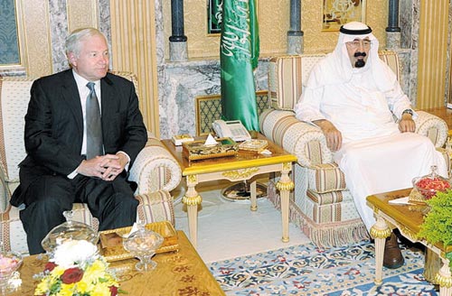 عقد خادم الحرمين الشريفين الملك عبدالله بن عبدالعزيز آل سعود -حفظه الله- اجتماعاً في مزرعته بالجنادرية مساء أمس مع معالي وزير الدفاع الأمريكي روبرت جيتس. وجرى خلال الاجتماع بحث مجمل الأحداث والتطورات في المنطقة إضافة إلى آفاق التعاون بين البلدين الصديقين.