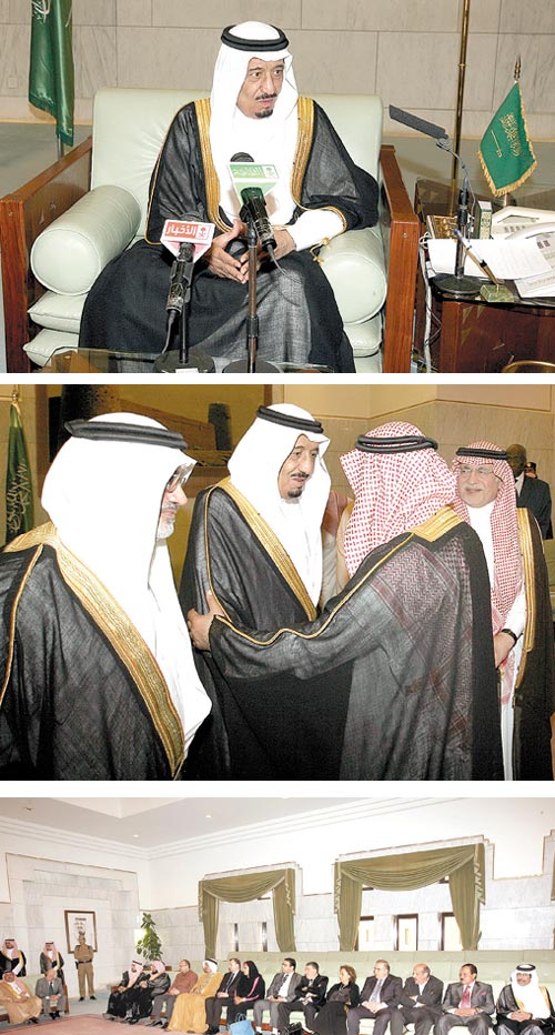 أكد صاحب السمو الملكي الأمير سلمان بن عبدالعزيز أمير منطقة الرياض أن المملكة العربية السعودية تتحمل مسؤوليتها أمام العالمين العربي والإسلامي والعالم أجمع بصفتها خادمة للحرمين الشريفين وقبلة للمسلمين ومهبطاً للوحي. وقال سموه: إن المملكة بقيادة خادم الحرمين الشريفين الملك عبدالله بن عبدالعزيز آل سعود وسمو ولي عهده الأمين وسمو النائب الثاني - حفظهم الله - تعي مسؤوليتها تماماً وتتشرف بها خصوصاً وأنها تستمد شرعيتها من كتاب الله عز وجل وسنة نبيه عليه أفضل الصلاة والسلام.